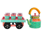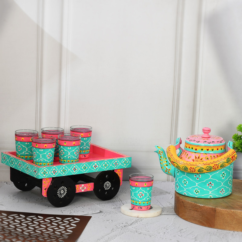 HandPainted Alluminium Tea Kettle with 6 Glasses and Wooden Tray For Home D?cor , Tea Party , Serving